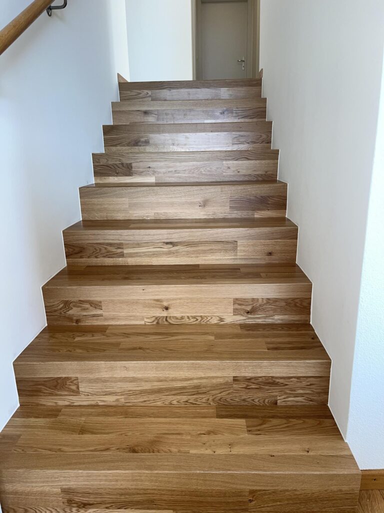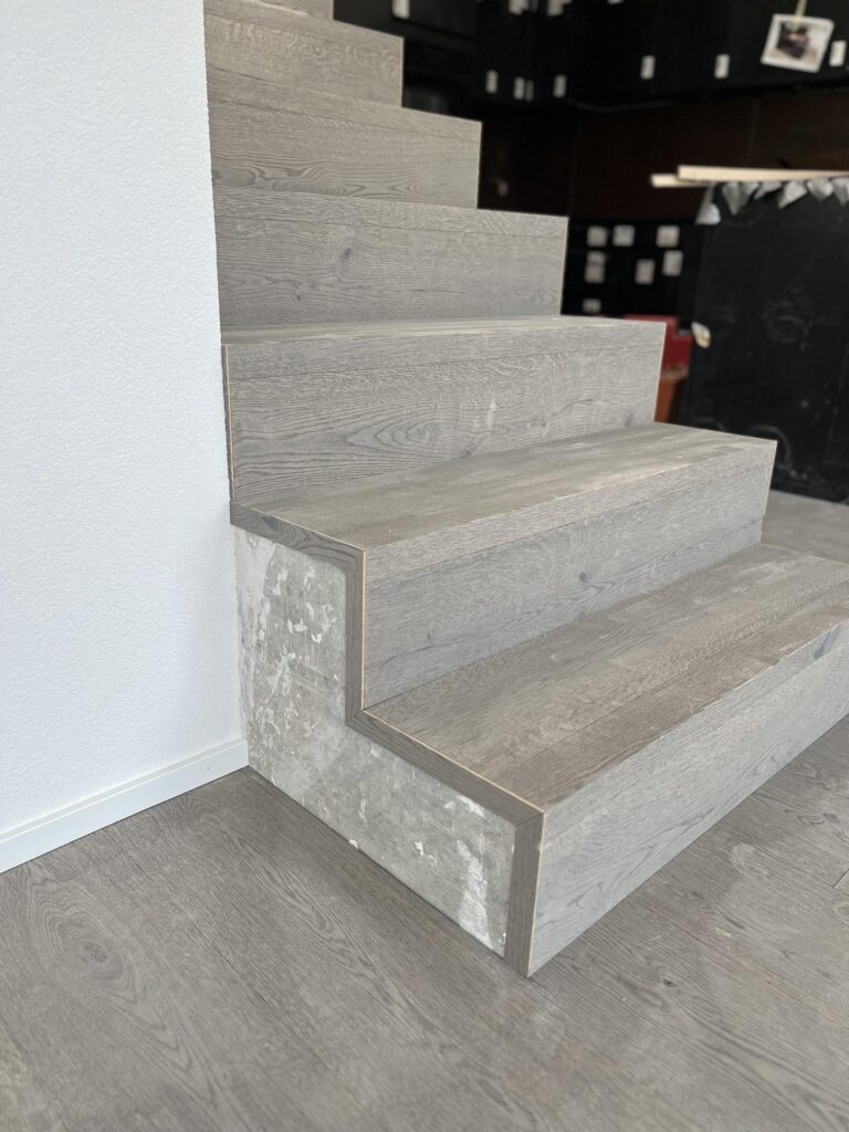 1. Contremarches : Dans certains projets, on peut recouvrir également les contremarches pour un effet complètement unifié. Assurez-vous d’aligner parfaitement la pièce pour un rendu rectiligne et un résultat professionnel.
